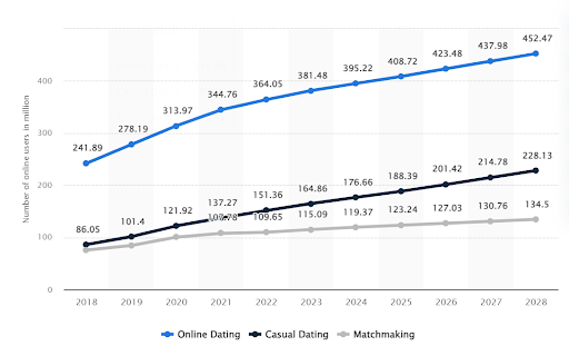 According to Statista, around 366 million (yes, million) people resorted to the services of online dating in 2022. And it’s believed that by 2028 this number should go up as high as 452.5 million users and the niche is expected to reach the market volume of $3.46 billion.