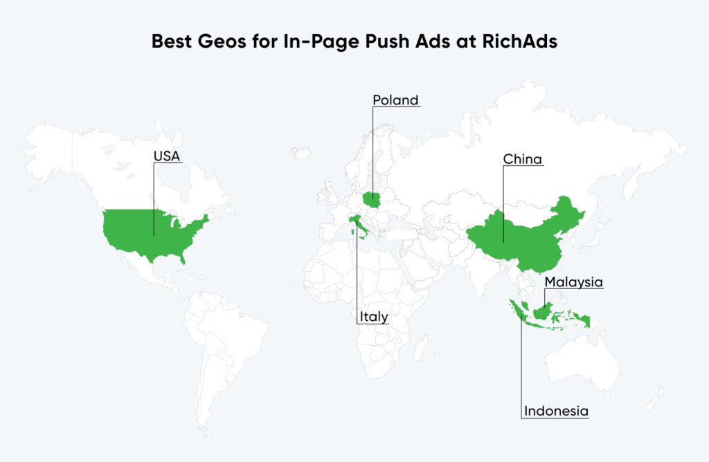С декабря 2023 года ситуация с топовыми ГЕО для пролива инпейдж-пушей на платформе RichAds существенно поменялась. Индия, Тайланд и Вьетнам покинули список самых конвертящих ГЕО для инпейджей, и на их место пришли Италия, Китай и Малайзия. Среди тех стран, что сохранили свои позиции с прошлого месяца и по-прежнему приносят профит на инпейджах: США, Индонезия и Польша.