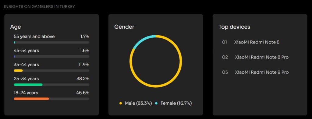 Турция это еще одно Tier 2 гео, но уже ближе всего к европейскому рынку. Годовой доход с гемблинга в Турции ожидаемо достигнет отметки в $25 миллионов к 2029 году, а количество активных игроков на данный момент уже составляет 8 миллионов. Аудитория состоит в основном из мужчин от 18 до 34 лет. Самые популярные девайсы для гемблинга делят ПК и мобильные устройства почти 50 на 50.