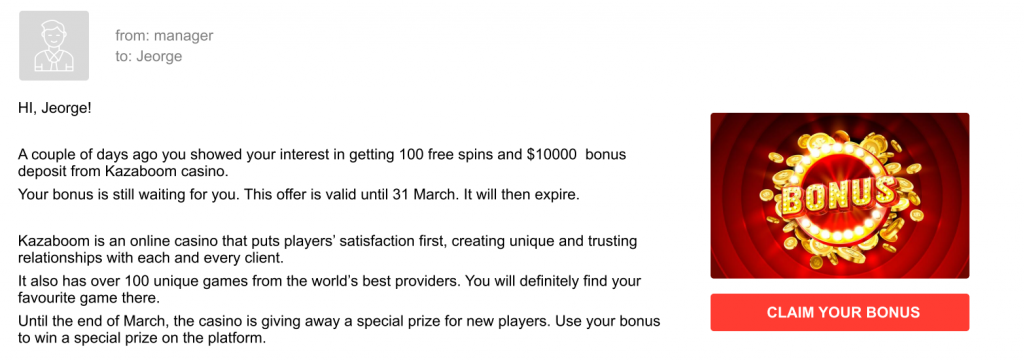 Затем, если человек не реагирует на подобное письмо и не вносит депозит, он получает второе письмо с напоминанием о бонусах и фриспинах при внесении депозита.