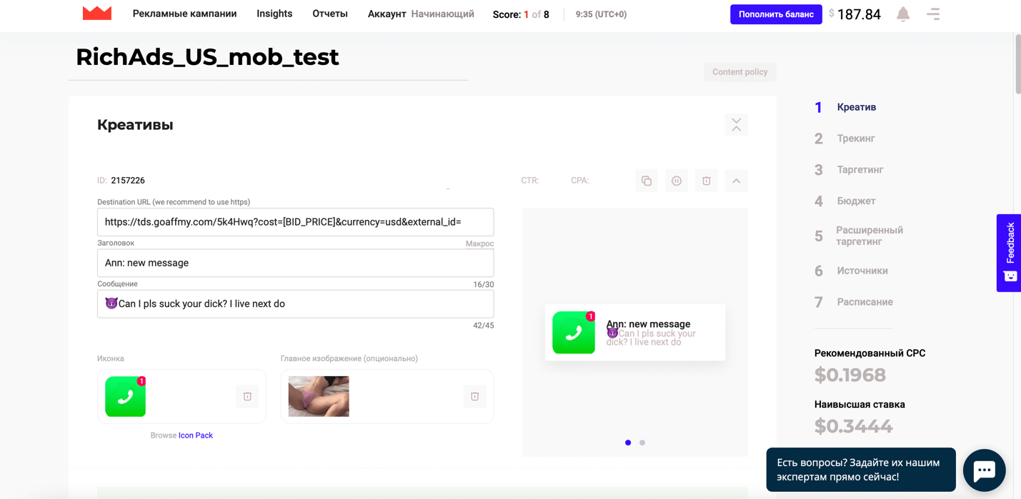 Для формата пушей существует множество рекламных сеток. Изучив самые популярные из них, выбор пал на RichAds по нескольким причинам. Во-первых, хорошие объемы и качество трафика на США. Во-вторых, богатый функционал для дальнейшей оптимизации: возможность использовать микро-ставки, исключать сабсорсы, версии ОС и регионы. И в-третьих, дружелюбный саппорт, который может помочь с настройкой кампании для большей эффективности.
