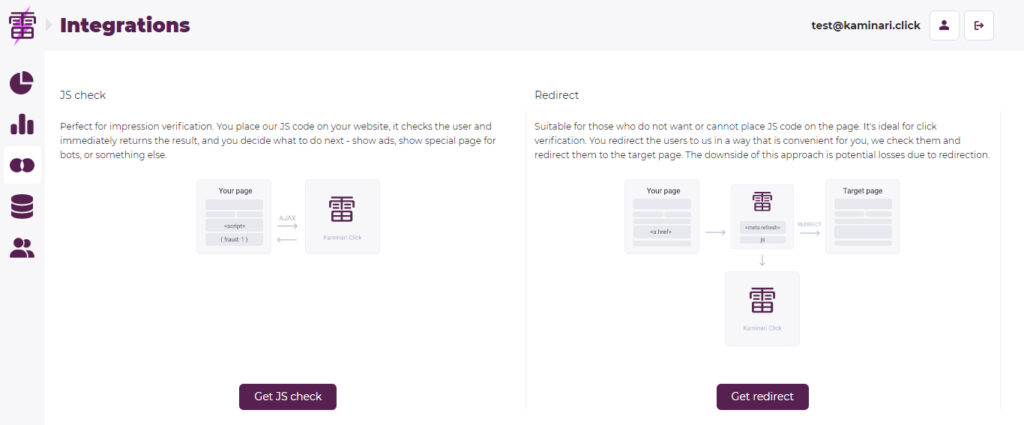 - Redirect: Choose click verification without placing JS code; redirect users to KC for thorough checks. While this method may involve potential losses due to redirection, it’s an optimal solution for those unable or unwilling to place JS code on their pages.