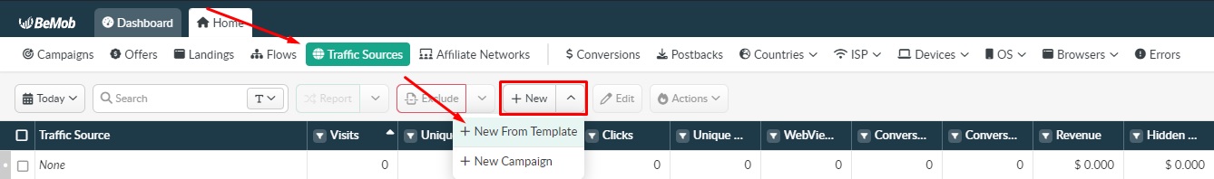 Click on the “Traffic Sources” tab in the tracker upper panel. Then click “New” button and select “New From Template”.