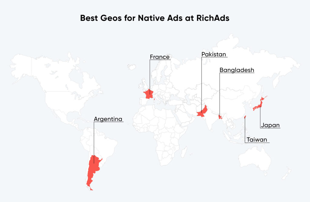 The top geos for native traffic in May 2024 are completely different to what they were the month earlier at RichAds. The only remaining region now is France, while the rest got completely replaced in terms of profitability and performance. So, in May 2024 you can launch native ads on Argentina, Pakistan, Bangladesh, Japan and Taiwan for greater outcomes!