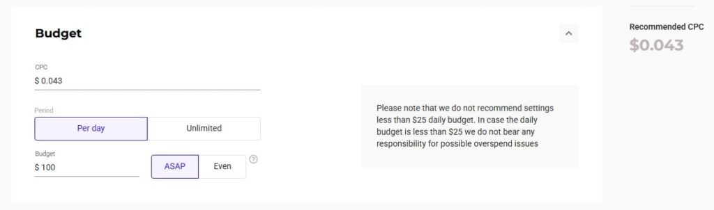 Рекомендуемая ставка отображается после выбора гео при настройке запуска и редактировании кампании, тогда как для рекламы в Telegram Mini Apps вы можете найти как CPC, так и CPM модели оплаты в зависимости от указанного типа креатива. К тому же, мы настоятельно советуем выставить ежедневный бюджет для кампании в размере от $25, а также указать опцию’ASAP’, с которой размещение будет заниматься как только ставка станет выигрышной и можно получить до 35% больше трафика в РК!