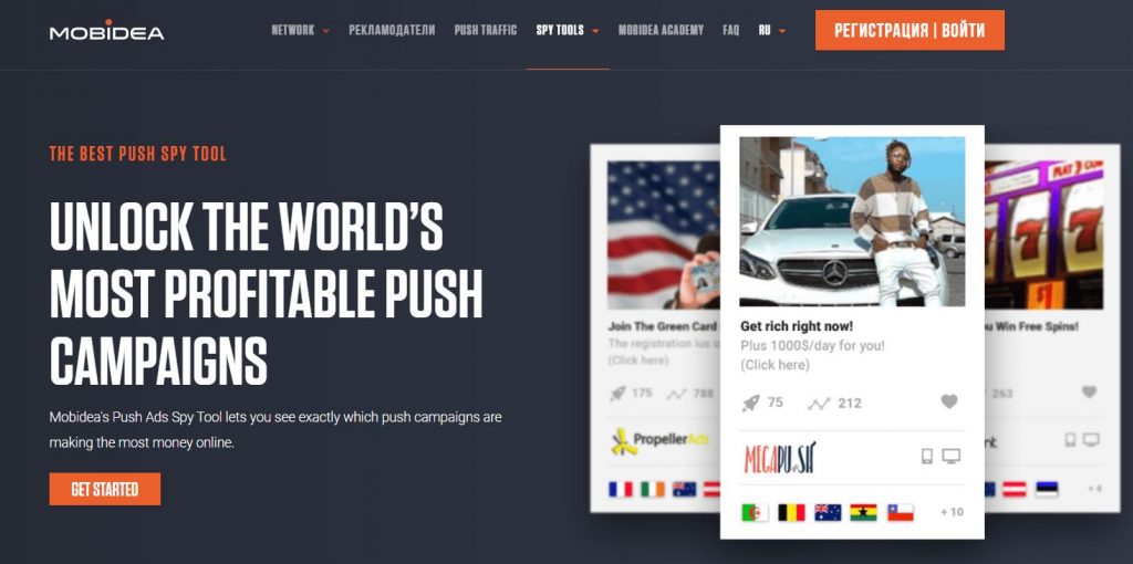 У рекламной сети Mobidea появился свой spy-сервис, и он вполне может подвинуть лидеров этой подборки. В этом сервисе мониторинга push-уведомлений более 19 млн рекламных объявлений из 92 стран мира.