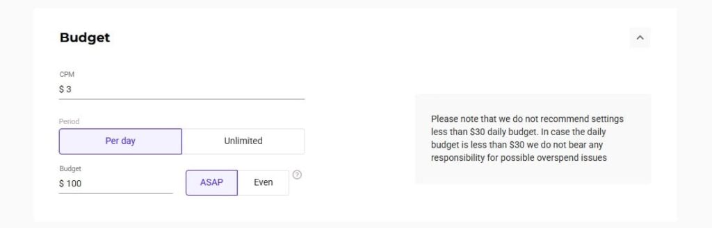 Unlike push-style format, the Interstitial video ads in Telegram Mini Apps at RichAds are processed by cost per mille (cost per 1000 views) model. Note that the daily budgeting for Telegram ad campaigns is recommended to be from $30, which would approximately cover at least 10 potential conversions in advance, while the higher budgets are more likely to show better results. It is also recommended to set budget spending by ‘ASAP‘, so that placings are picked as soon as the bid is winning and get up to 35% more traffic!