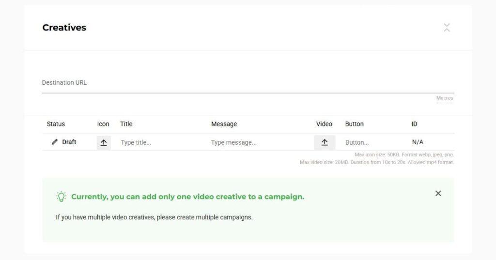 For now, you can add only one creative per campaign for Interstitial video format at RichAds, while for testing more of those it requires creating separate campaigns.
