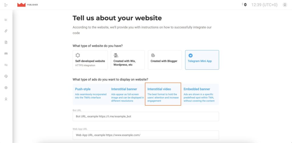 If you want to monetize your own project in Mini Apps with Interstitial video format for Telegram — you can become a publisher at RichAds ad network! Simply select the desired format while registering as one, and start earning money on showing this new type of advertisements to the audience of your mini application. Learn more from our article on monetizing Telegram Mini Apps!