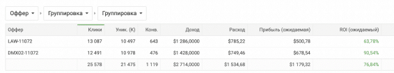Интересно, какие показатели получились в разрезе по офферам. LookAWoman получил ROI 63,78%, а DateMinx — 90,54%.