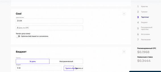 Цену за клик устанавливаем $0,04, хоть система и предлагает почти $0,2 – для тестов это слишком большая ставка. Минимальный бюджет в день у сетки – $30, его и поставили. Включили ASAP (тратить как можно скорее), чтобы получить больше трафа и собрать стату быстрее.
