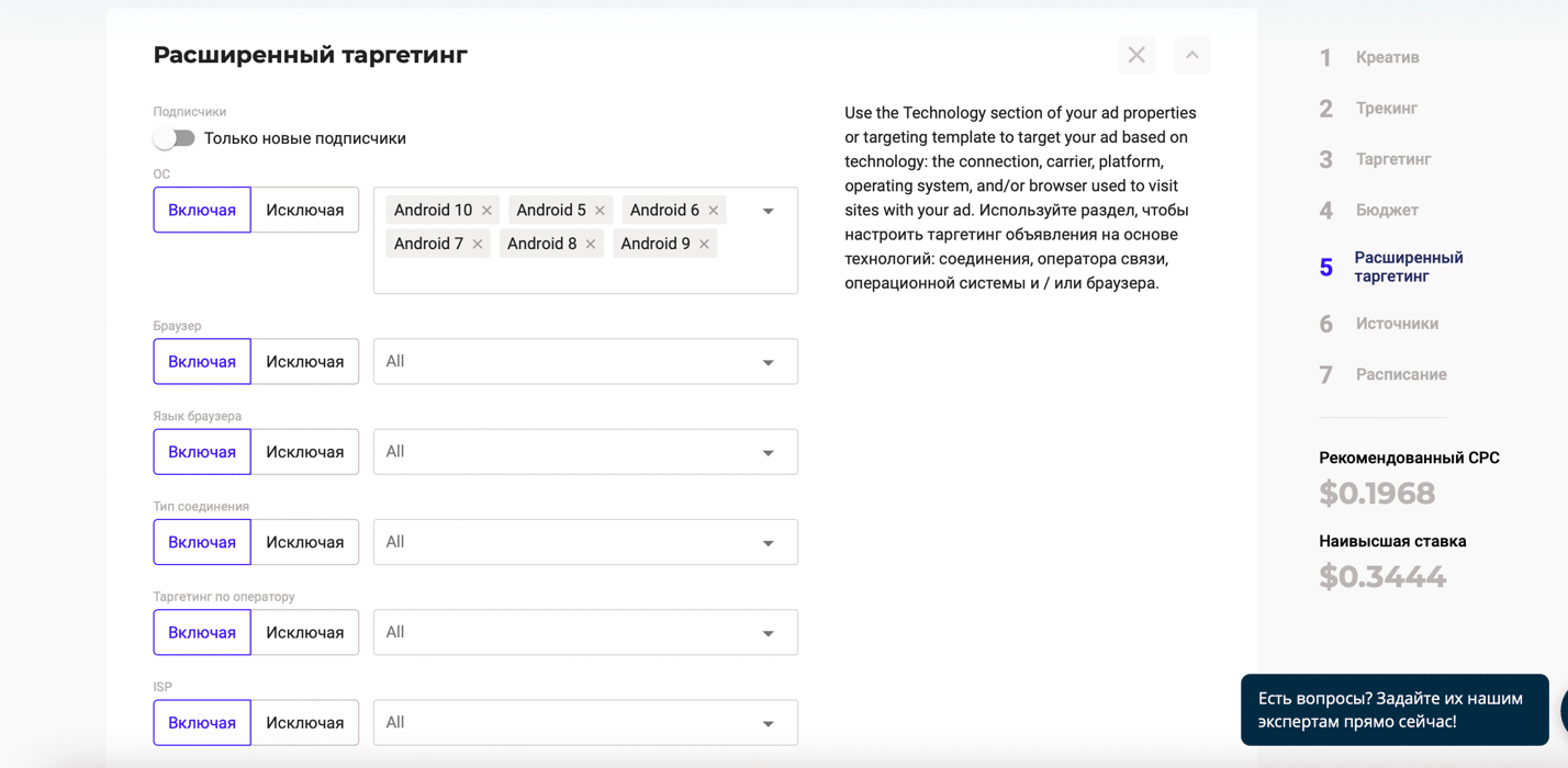 Для формата пушей существует множество рекламных сеток. Изучив самые популярные из них, выбор пал на RichAds по нескольким причинам. Во-первых, хорошие объемы и качество трафика на США. Во-вторых, богатый функционал для дальнейшей оптимизации: возможность использовать микро-ставки, исключать сабсорсы, версии ОС и регионы. И в-третьих, дружелюбный саппорт, который может помочь с настройкой кампании для большей эффективности.