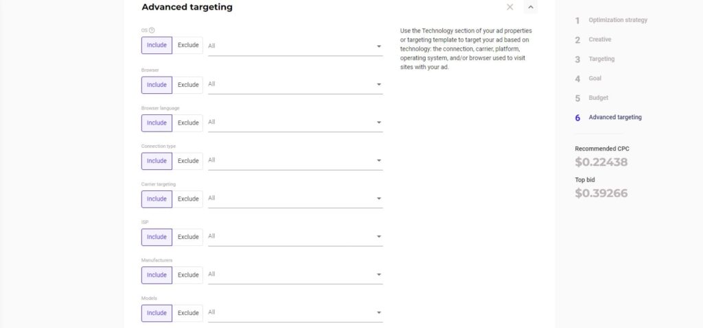 Данный алгоритм подбирает лучшие сорсы именно на основании вашего таргетинга, так что будьте предельно внимательны. Вкладку Advanced targeting рекомендуется не трогать, если выставления отдельных параметров таргетинга, например, ОС или мобильного провайдера, не обусловлено оффером.