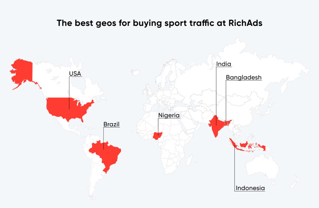 Так куда же лучше всего закупать спортивный трафик, чтобы получить желаемые результаты? Можно провести самостоятельный ресерч отдельных гео, где наблюдается наибольший интерес аудитории к ставкам на спорт и азартным играм, а можно просто взглянуть на те регионы, которые уже имеют высокий отклик на офферы беттинга.