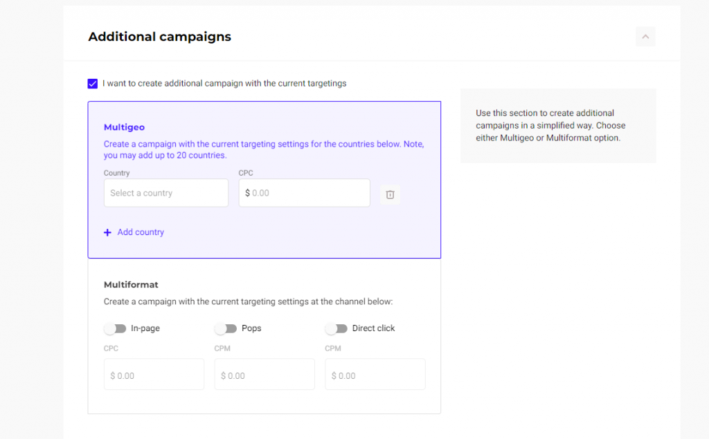 In order to create a campaign for another geo, you only need to select a country. The recommended bid value will appear next to it. CPC rates can be adjusted according to your preference.