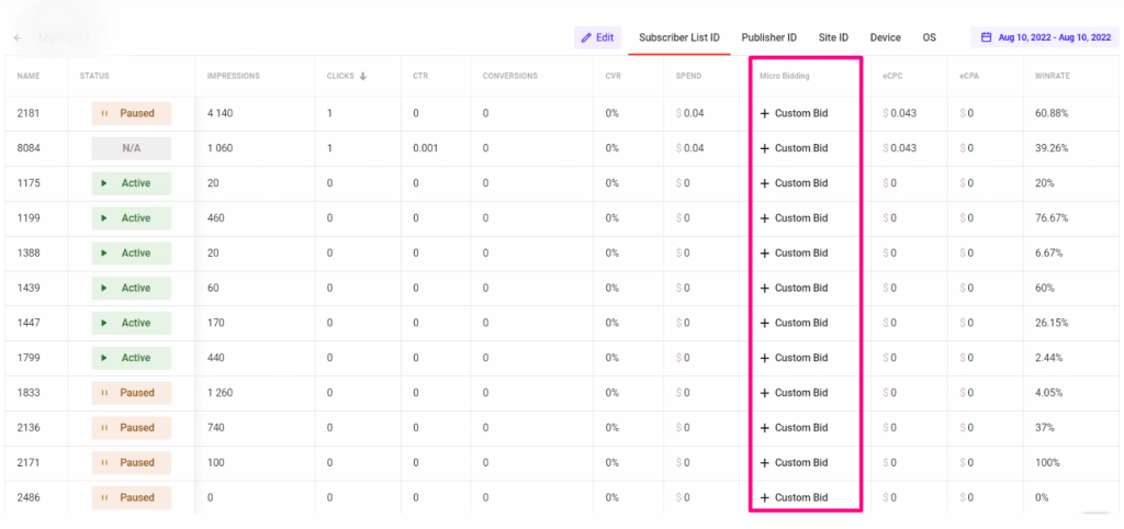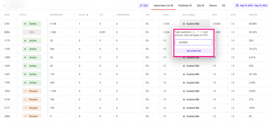 For example, enter +0.0005 in the line opposite to the desired Site ID and this way you’ll raise the bid by 0.0005.