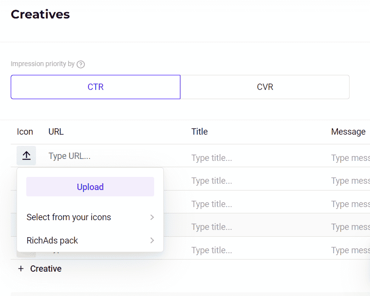 - Reusable icons. This feature will significantly reduce the amount of time you spend on creating a campaign and simplify the search for suitable creatives. In order to use icons from previous campaigns, you just need to click on the “Icon” and choose “Select from your icons”:
