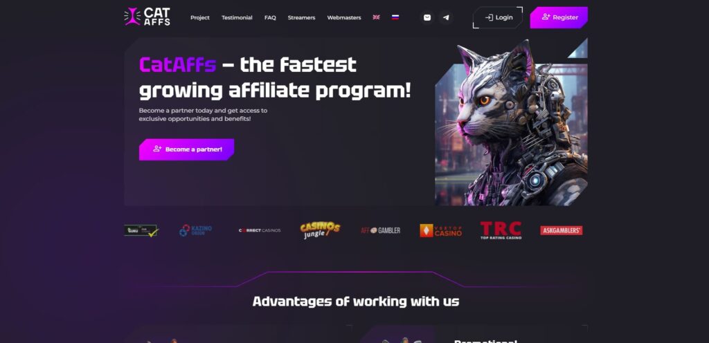CatAffs belongs to the types of affiliate programs that present a variety of in-house offers: Kometa, R7, Kent, CatCasino, Daddy Casino and Gama Casino. The affiliate program was established only in 2021, but already has a worldwide geo coverage. CatAffs offers CPA (up to €250), Dynamic RevShare (up to 45%), Hybrid and Subpartner payout models.