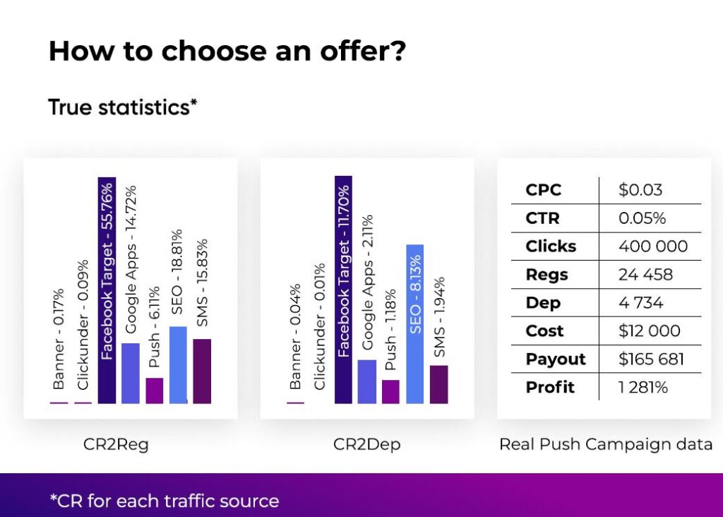 Using the CPA model, it’s crucial to give users truthful information. For example, a false bonus in a creative can increase the number of players who make one deposit. But after they understand that they have been deceived with the non-existent bonus, they will stop their journey on the product. It means that you won’t get paid.