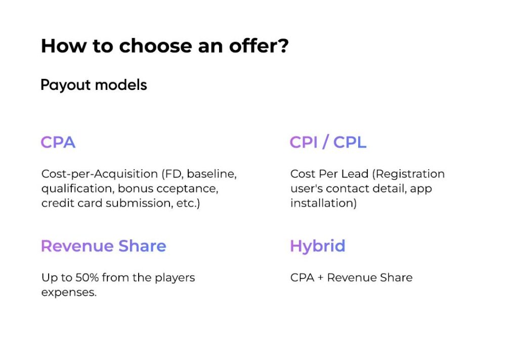 When working with casino offers, the most popular payout models are CPA and Revenue Share.