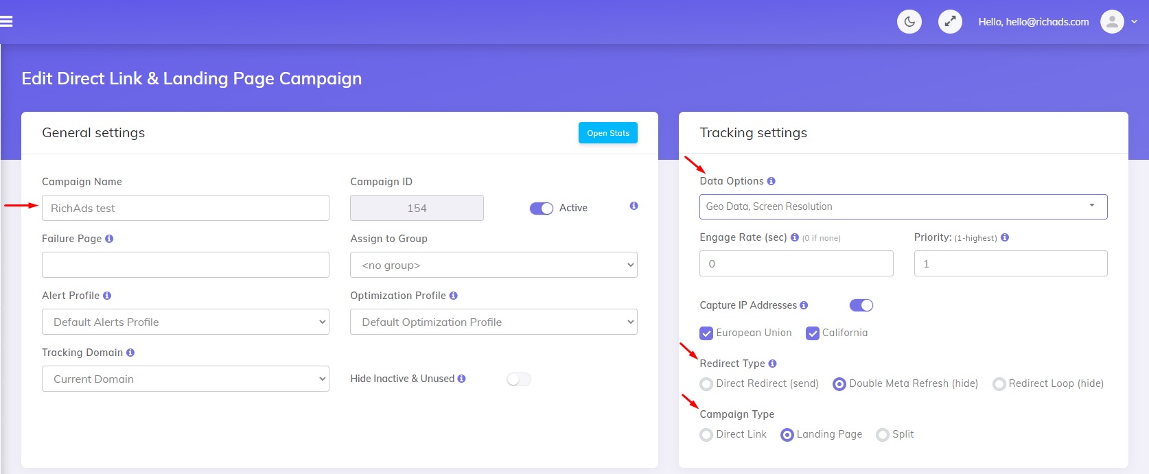 In the opened page, at first select the campaign’s name, data options, redirect type and campaign type.