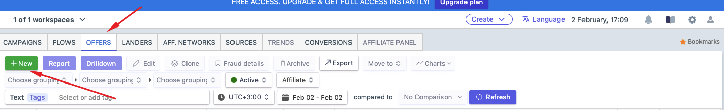 Type the affiliate network name and choose the needed among the “Affiliate network” list that will drop. The menu will include all APs that have been added to the tracker. Then press “Create offer”.