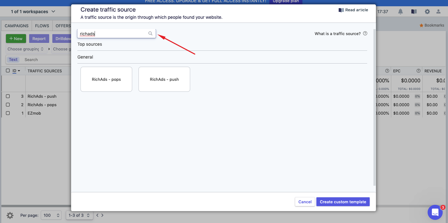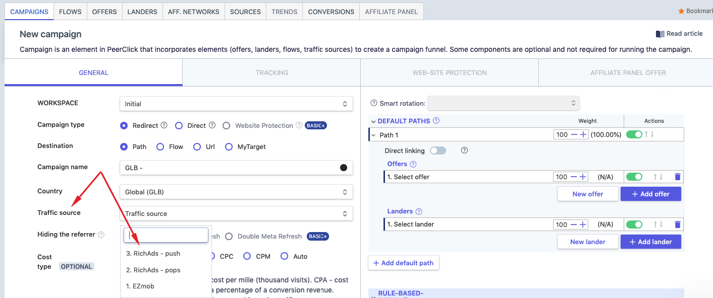 Choose a traffic source in the “Traffic source” field. In our case, it’ll be either “RichAds Push” or “RichAds Pops”.