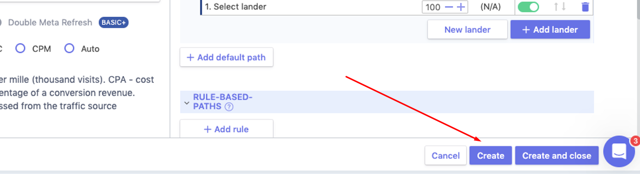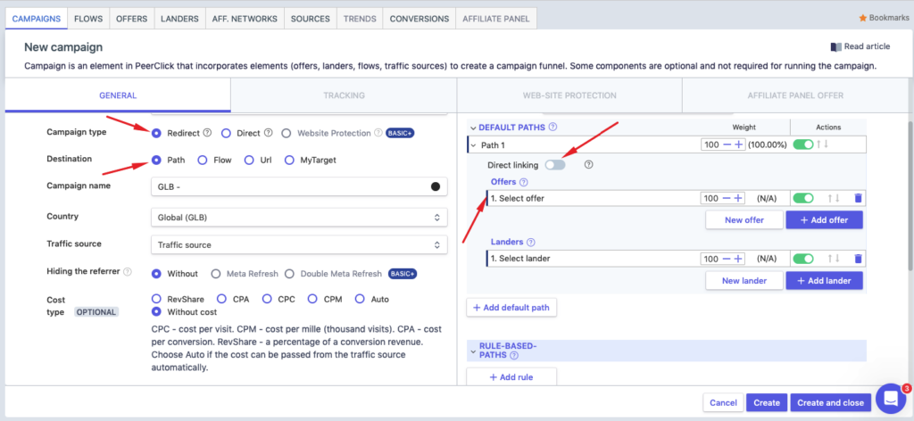 Choose “Redirect” in “Campaign type” and also “Path” in “Destination”. In the “Offers” menu, choose the offer you’ve connected previously.
