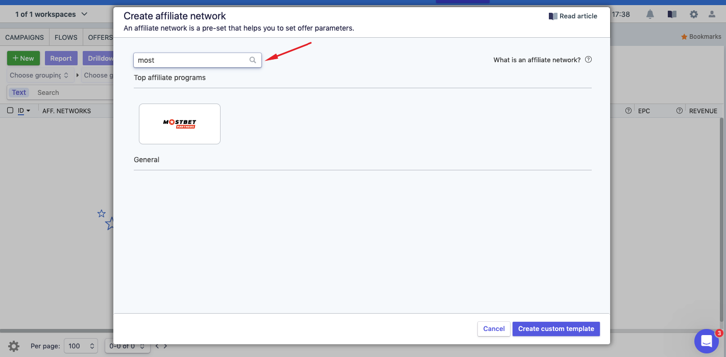 Type the affiliate network’s name in the search bar and pick a template. For our example, we added MostBet.