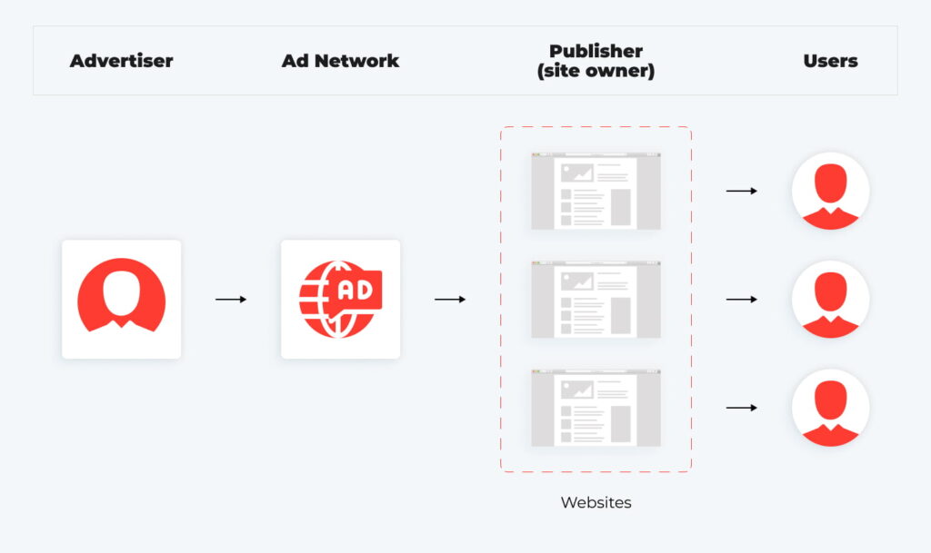 Ad network have technologies that collect ad space from publishers and sell it to advertisers. As a result, publishers can easily monetize their sites. And advertisers get access to a large amount of ad space at once, where they can find customers.