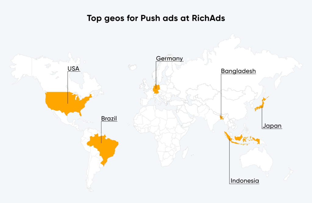 Currently, the top geos to promote offers on push advertising notifications in early 2025 at RichAds are USA, Germany, Indonesia, Bangladesh, Brazil and Japan.