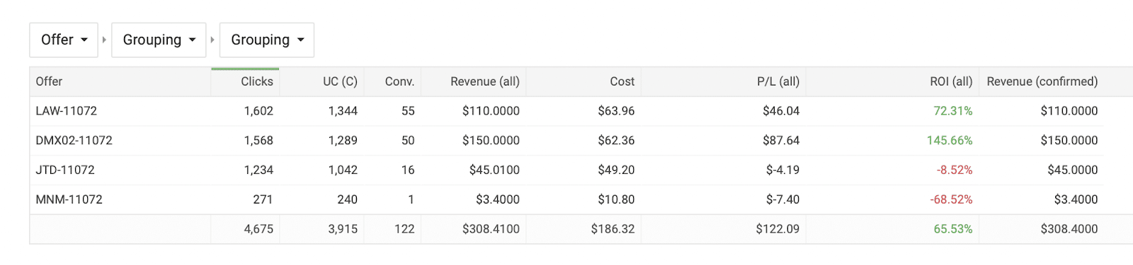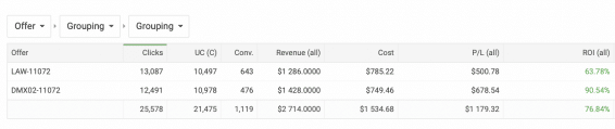 The indicators obtained by offer were interesting. LookAWoman got an ROI of 63.78% and DateMinx got 90.54%.