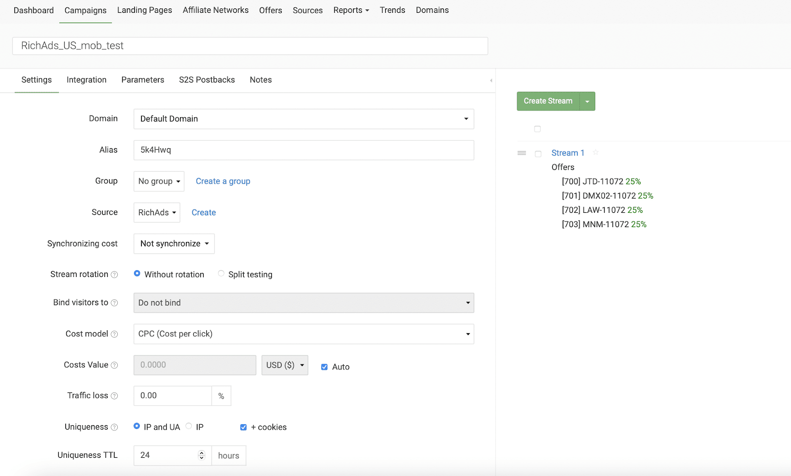 We add the campaign in the tracker and create a stream of four offers. For the test, we distribute 25% for each one to gather the statistics. Later, if required, we will be able to distribute traffic in the percentage we need based on the data received during the optimization.